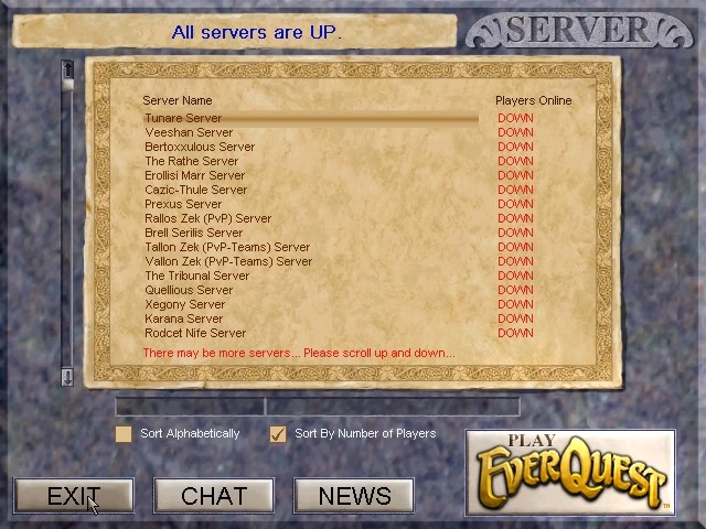 Oct 18 19:17:58 EDT 1999 - The EverQuest Team -Crappy, huh guys? -Dread News: (10/18/99) -The Roster is starting to fill out, and the counter is rising. Keep sending me your info. -Anybody out there have any unused writing skills? I have a very empty Stories section of the page that could use some filling :-) -A press release has been put out by Verant. Check it out here!